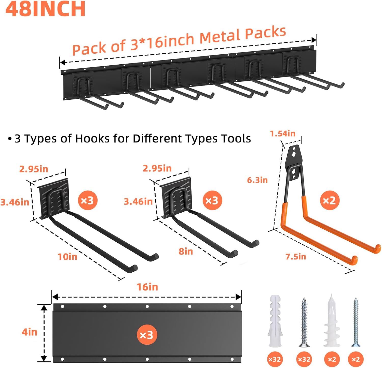 - [Practical Garage Wall Organizer]: The garage tool organizer wall mount is designed to bring order and space saving to your messy garage, garden or workshop; This garage wall rack for tools comes with 3 8-inch adjustable hooks, 3 10-inch adjustable hooks, 2 orange garage storage hooks and 3 16-inch rails