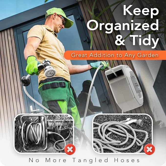 - 【Tidy Looking in Yard】: The guide mechanism in hose reel that shifts from side to side to evenly distribute the hose and keep organized. And the included hoses all have a nice smooth glossy finish that washes off easy after being dragged through garden dirt and mud which makes keeping clean a snap before storing the hose away.