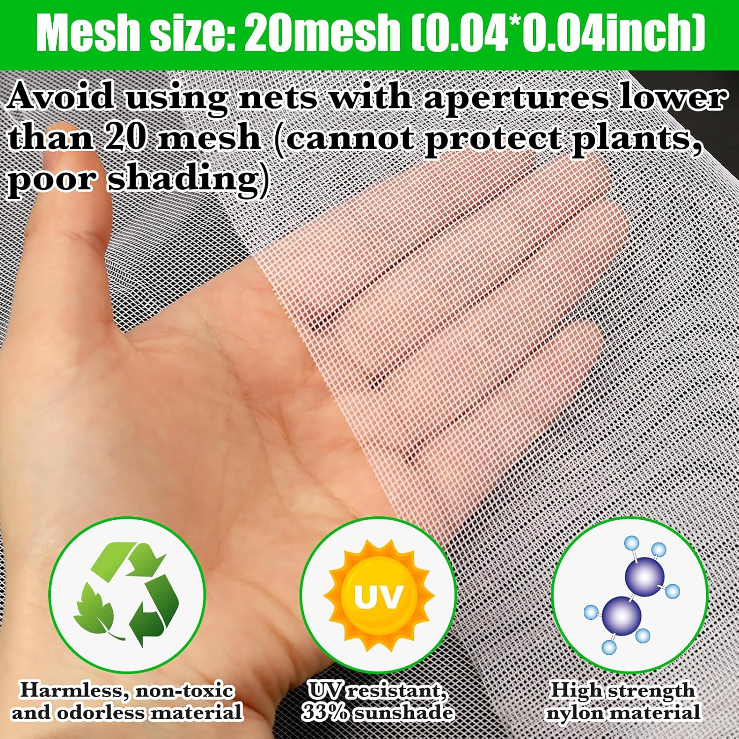 - 33% shading rate: White plant netting provides 33% shade to keep your outdoor plants cool, effectively reduces direct sunlight, helps lower soil temperatures, reduces frequent watering, and provides a comfortable environment for plants and gardens