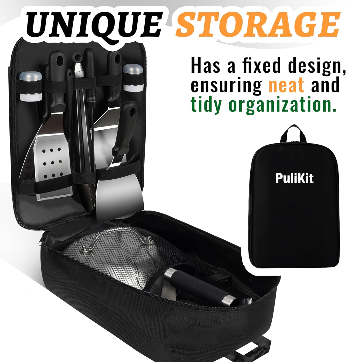 - Universal Compatibility & Space-Saving Design: Works seamlessly with Blackstone 28"/36" griddles, Camp Chef FTG models, and most outdoor flat tops. Compact fold able tools + vertical bag storage save 50% space vs traditional kits. Bonus silicone hook lets you hang essentials mid-cook.