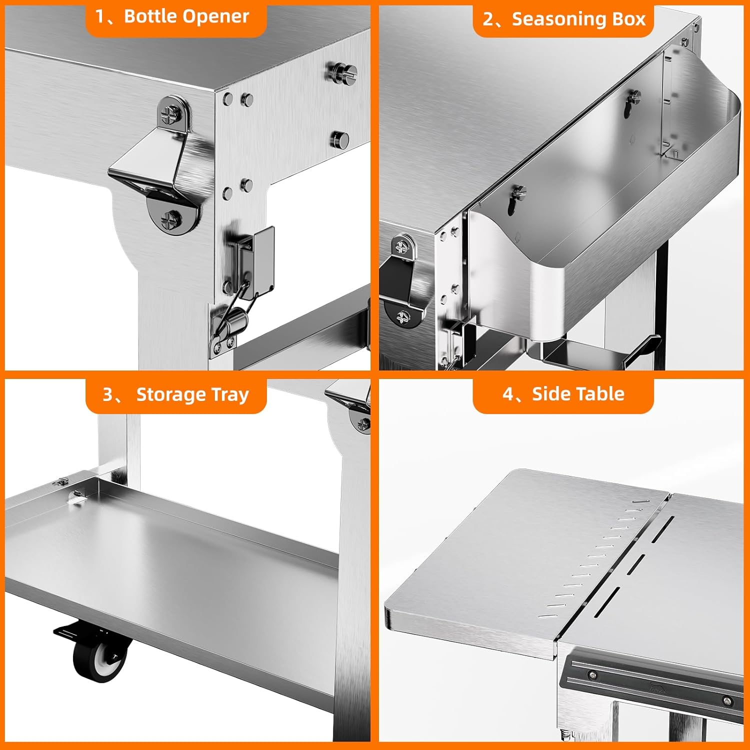 - HUMANISED DESIGN: Our outdoor grill cart is equipped with a seasoning box, bottle opener, towel rack and magnetic knife holder to ensure a clean and tidy workspace throughout the cooking process,enhance your cooking experience