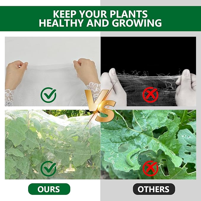 - 【Ultra Fine Garden Insect Netting Screen】The 10 x 30FT garden netting is made of polyethylene. Ultra-fine mesh size is 0.8mm x 1mm, superfine thickened mesh, strong wear resistance and toughness. Not only can keep insects or other small animals out, but also allowing air, light and water through, for the growth of your plants to provide a good environment.