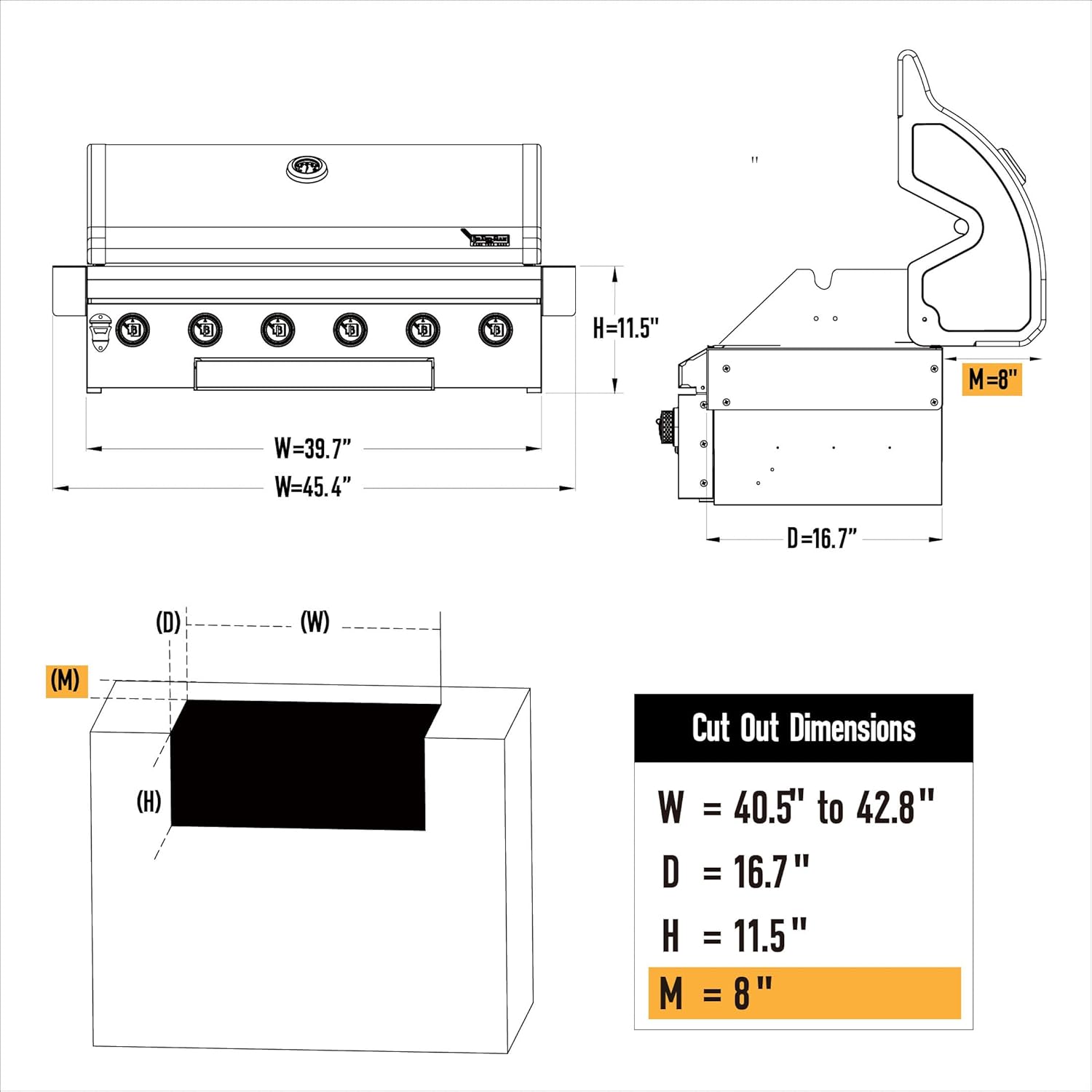 - Overall Dimensions: 39.7'' to 45.4'' (W) x 20.8'' (D) x 18.6'' (H); Cutout Dimensions: 40.5'' to 42.8'' (W) x 16.7'' (D) x 11'' (H). Ensure a perfect fit in your outdoor kitchen with these precise dimensions
