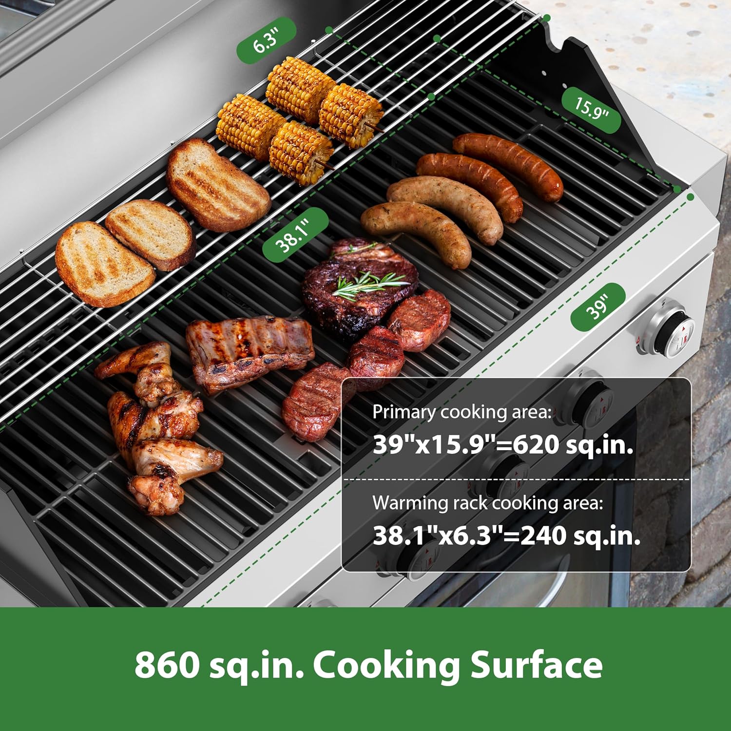- Cook More, Serve More: With a generous 860 sq.in. of cooking space, our BBQ grill offers a 620 sq.in. primary area with cast iron grates and a 240 sq.in. warming rack. Ideal for cooking multiple dishes at once, it's perfect for large gatherings and family feasts