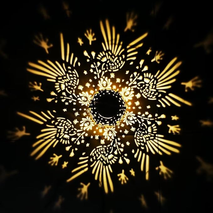 - The lantern projects a breathtaking shadow display, radiating an intricate symphony of light and artistry. The pattern showcases elegant hummingbirds with outstretched wings, encircling a luminous center like guardians of a celestial garden. Blossoming flowers and delicate starbursts weave into the design, creating a harmonious blend of nature and fantasy. The interplay of light and shadow evokes a serene and ethereal atmosphere, turning any space into a poetic haven of tranquility.