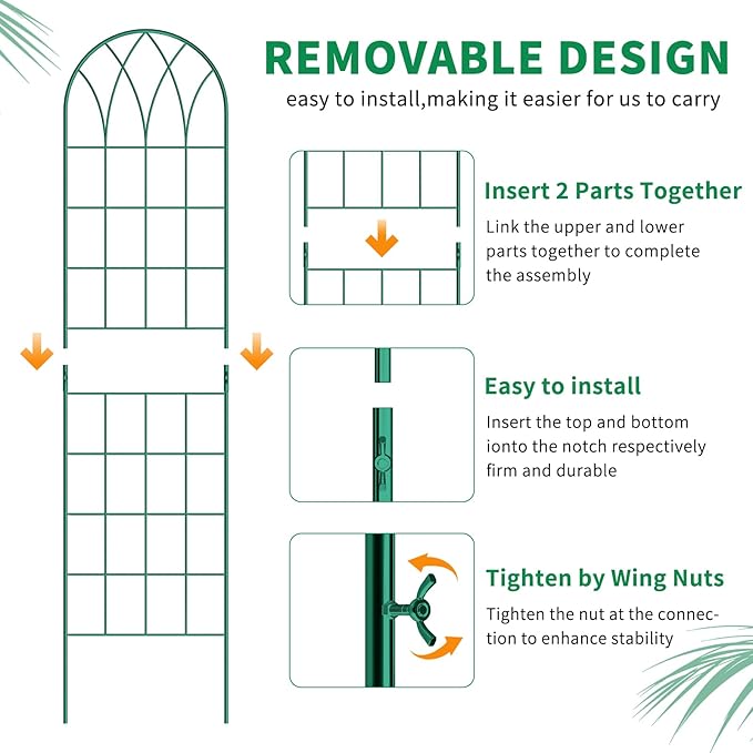 - 【 Effortless Installation】 Setting up our trellis for climbing plants is a breeze. Simply connect the top and bottom pieces to easily assemble a piece of garden trellis. Then simply insert the lower spiked legs into the ground