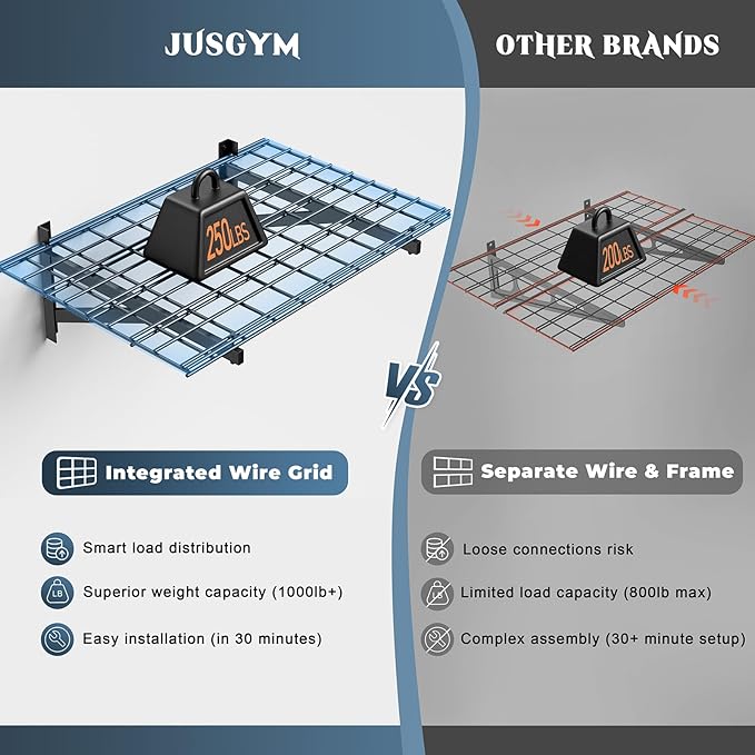 - 📦【All-in-One Mesh Storage】- The seamless welded mesh design securely holds tires, sports gear, toolboxes, and plastic bins without sagging. Open-grid airflow prevents dust buildup, while the anti-rust coating ensures durability in humid garage environments.