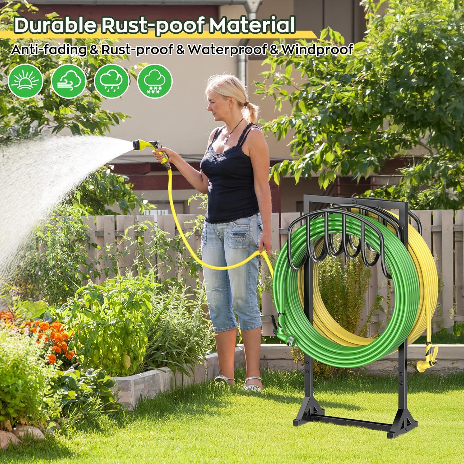 - 【Upgraded 4-Anchor Base for Rock-Solid Stability】 Featuring 4 reinforced spikes (2.5cm longer than others), this hose stand resists wobbling even on uneven terrain. Ideal for outdoor hose storage in yards, gardens, and driveways.