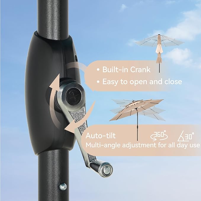 - Easy to Adjust: This umbrella Outdoor patio is designed with crank opening system and easy to adjust, it can be easily opened, closed and tilted from 0-45° through the hand crank adjustment, which is easy and quick to use, and it can provide more angle of shade protection and better shading effect.
