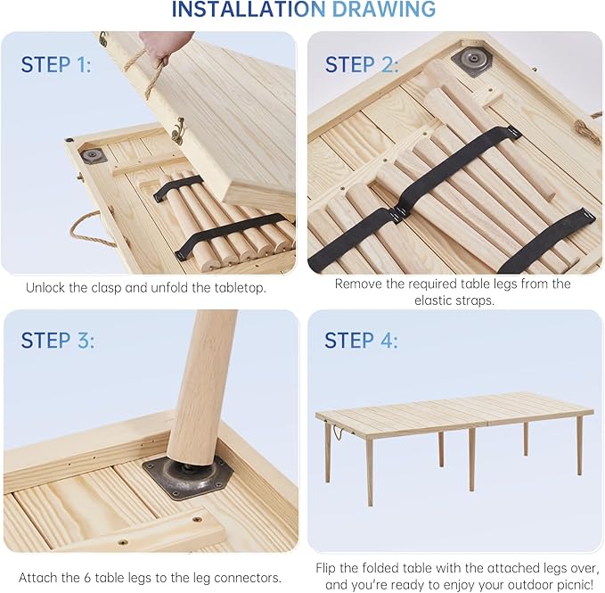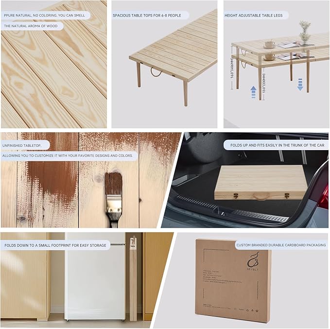 - HANDCRAFTED FROM NATURAL PINEWOOD: Our Wooden Folding Picnic Table is expertly handcrafted from natural pinewood, with each piece of wood carefully selected as a gift from nature. The removable table legs are made from durable rubberwood, providing a sturdy base, and the unfinished surface brings a touch of bohemian charm while ensuring long-lasting durability.