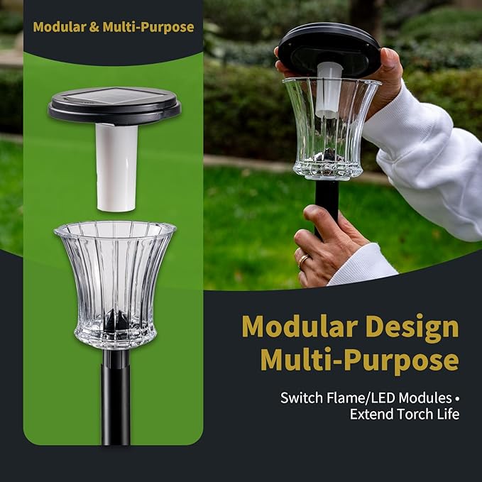 - High-Efficiency Solar Power & Easy Install - Our solar torch lights collect energy all day through efficient panels for evening illumination. When fully charged, enjoy over 10 hours of realistic dancing flames that create a warm, comfortable atmosphere perfect for garden decor, pathway lighting and patio gatherings. Sensors automatically activate at dusk and deactivate at dawn. Installation is simple - no tools or wiring needed, just insert into ground for instant torch-like ambiance.