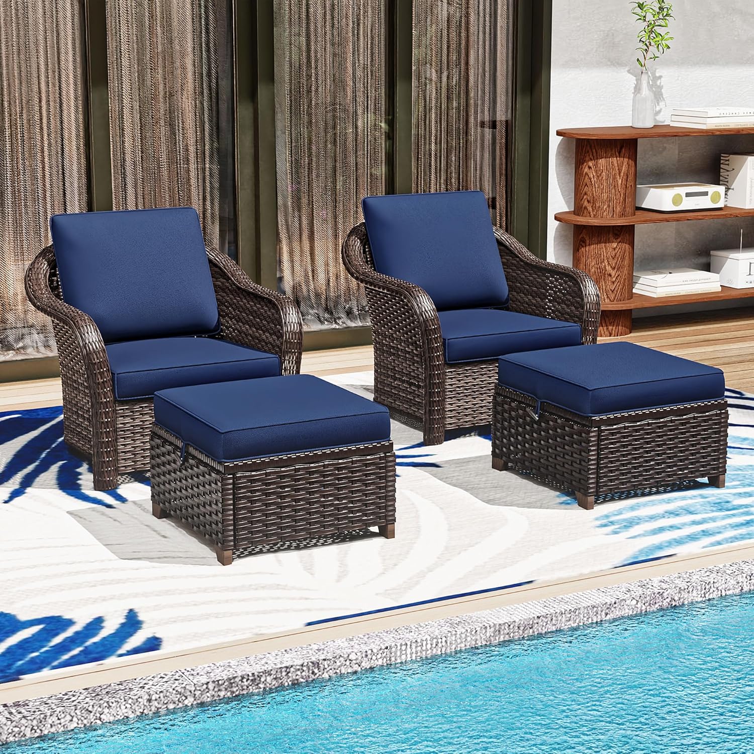4 Pieces Patio Outdoor Conversation Furniture Set with Cushions, All-Weather Wicker Ottomans, PE Rattan 2 Chairs for Backyard, Deck, Lawn (Navy Blue)