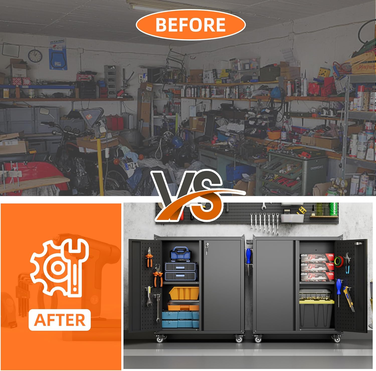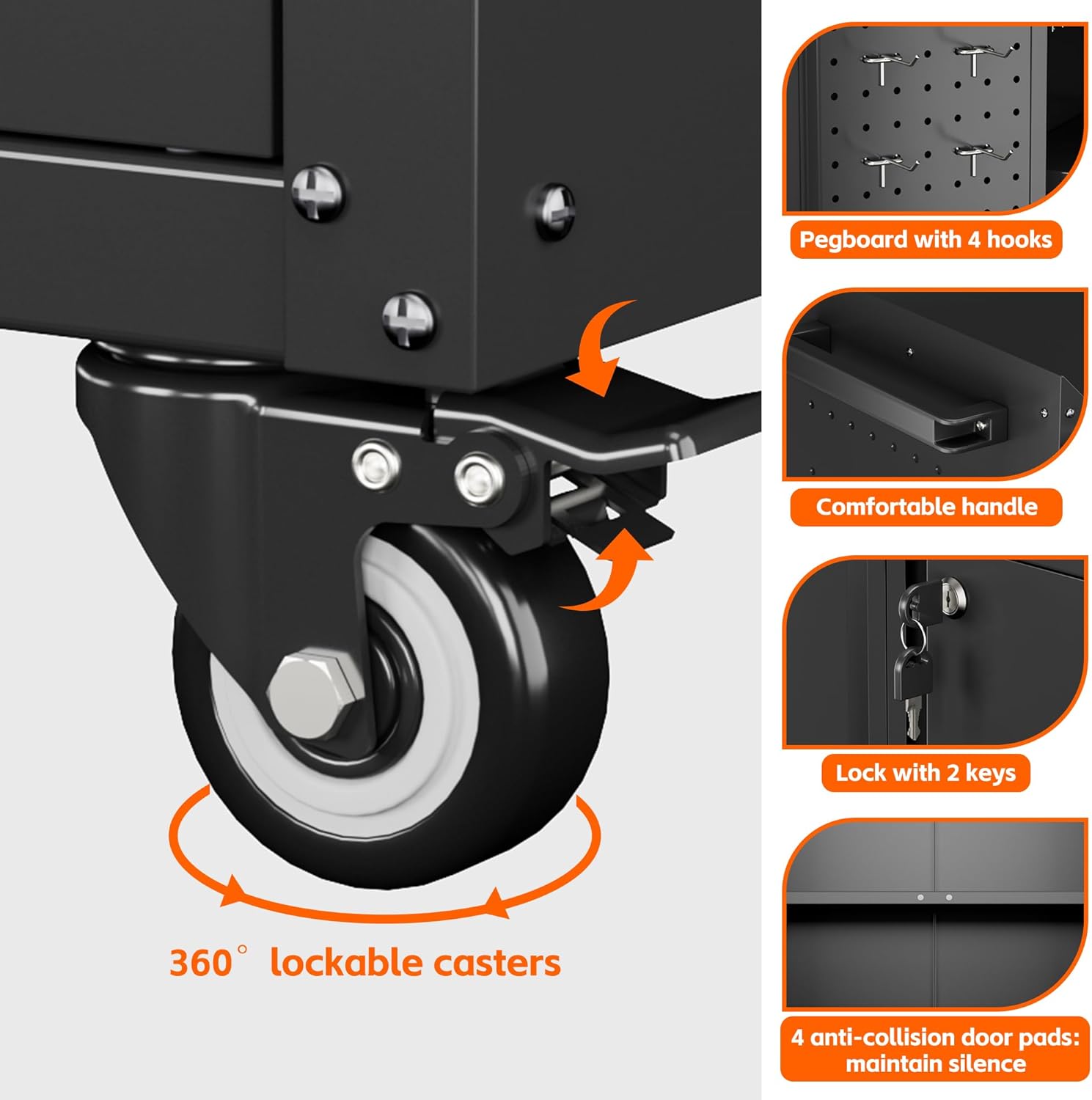 - Heavy Duty Metal Frame & Environmental Coating: Our garage storage cabinet with wheels are made of heavy gauge cold-rolled steel plate, load capacity up to 120lbs each shelf and strong. Environmental powder coating means excellent rust and water resistance;