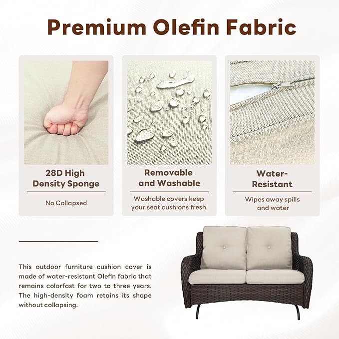 - 4. Comfortable Deep Seating with Plush Cushions: The loveseat glider chair and swivel glider chairs come with 4-inch thick, sponge-padded cushions that provide excellent support and comfort. The high backrest and wide armrests enhance relaxation, while the olefin fabric is water-repellent, easy to clean, and fade-resistant for long-term use.