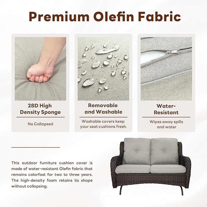 - 360° Swivel & Smooth Glider Chairs – Enjoy ultimate comfort with the swivel rocker chairs featuring 360° rotation and a gliding function, while the loveseat glider chair offers a soothing back-and-forth motion, making Belord outdoor patio furniture set ideal for outdoor lounging.