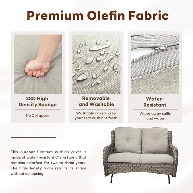 - 4. Comfortable Deep Seating with Plush Cushions: The loveseat glider chair and swivel glider chairs come with 4-inch thick, sponge-padded cushions that provide excellent support and comfort. The high backrest and wide armrests enhance relaxation, while the olefin fabric is water-repellent, easy to clean, and fade-resistant for long-term use.