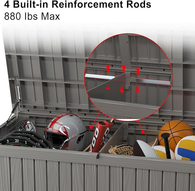- Hydraulic Support for Easy Lid Opening:Equipped with hydraulic support, this deck box lid opens smoothly and stays open, providing easy access to your stored items. No need to struggle with heavy lids anymore.