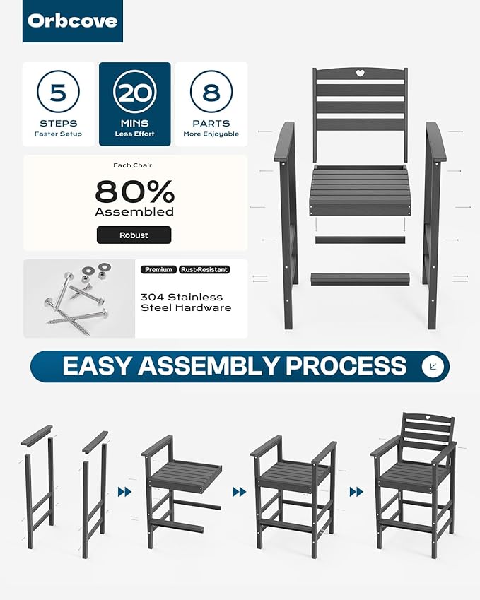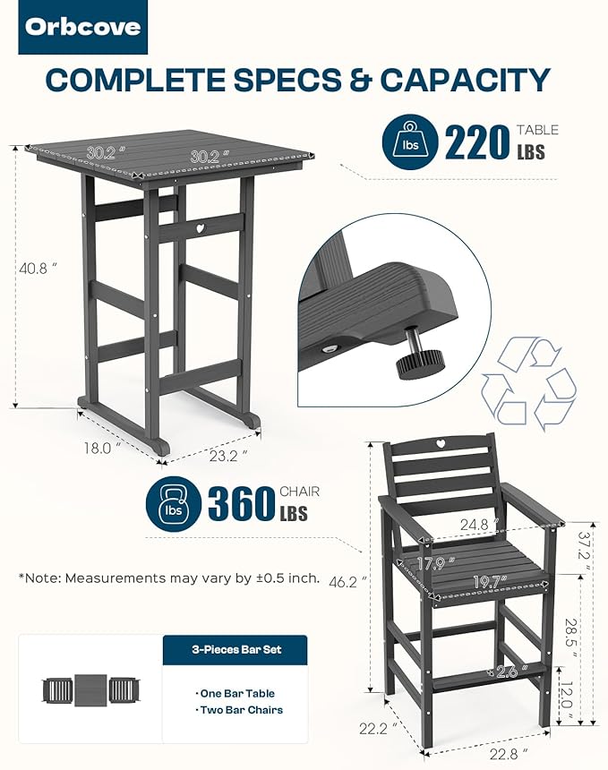 - Durable All-Weather Design: (Please note!!!Your order consists of two or three separate packages, which may be delivered at different times.) Crafted from HDPE with a natural wood grain finish, Orbcove bar table and chairs set withstands sun, rain, and wind without fading or cracking. Ideal for deck furniture, backyard furniture, or porch furniture, it’s perfect for year-round outdoor living.