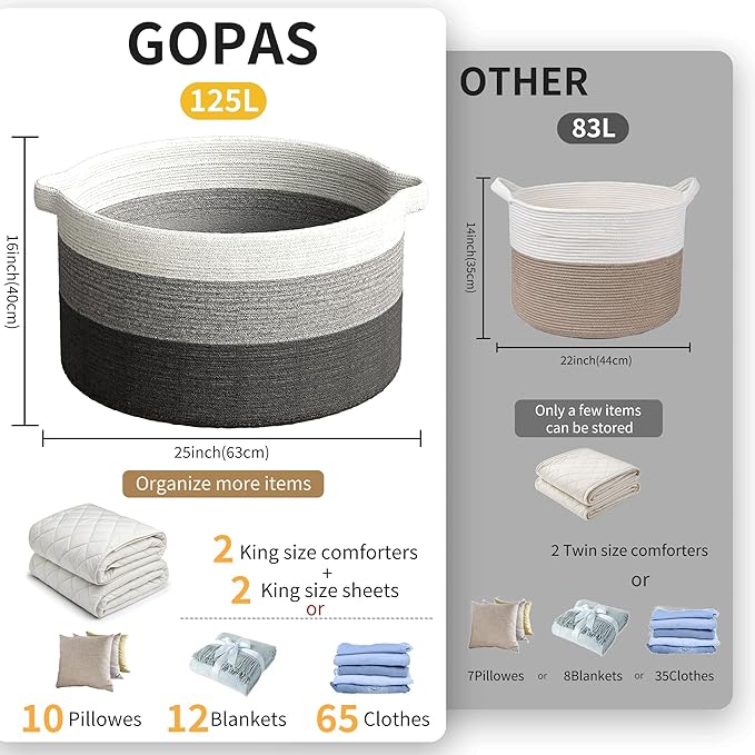 125L Extra Large Blanket Basket, 25" x 16", Jumbo Laundry Woven Baskets Decorative Home, Cotton Rope Basket with Handles, Baby Toy Baskets for Storage, Gradual Gray