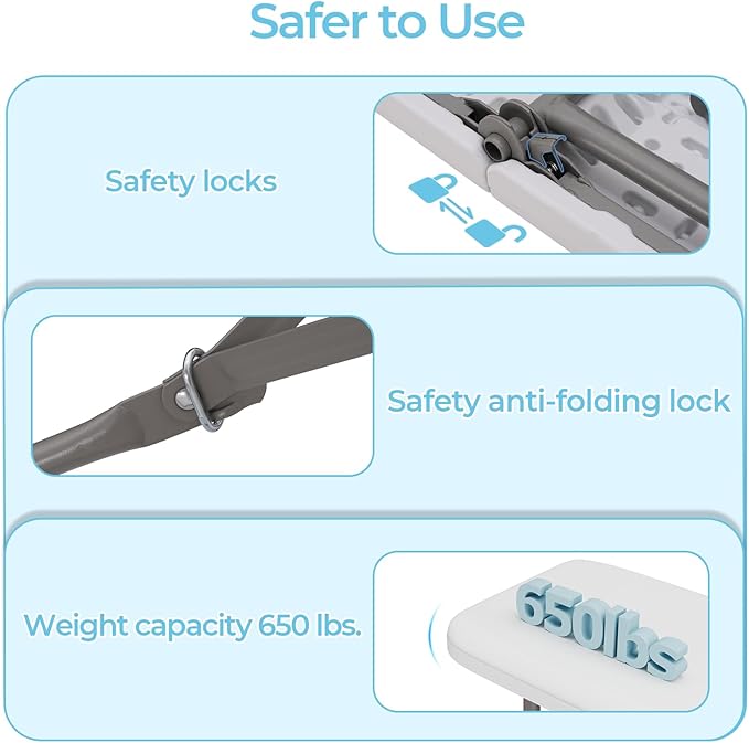 - Superior Quality and Sturdy:Our 6ft folding bench is made of premium high-density polyethylene (HDPE) material with a padded top for extra durability. The sturdy frame is coated in gray for both beauty and stability. The maximum weight capacity of the bench when unfolded is 600 lbs.