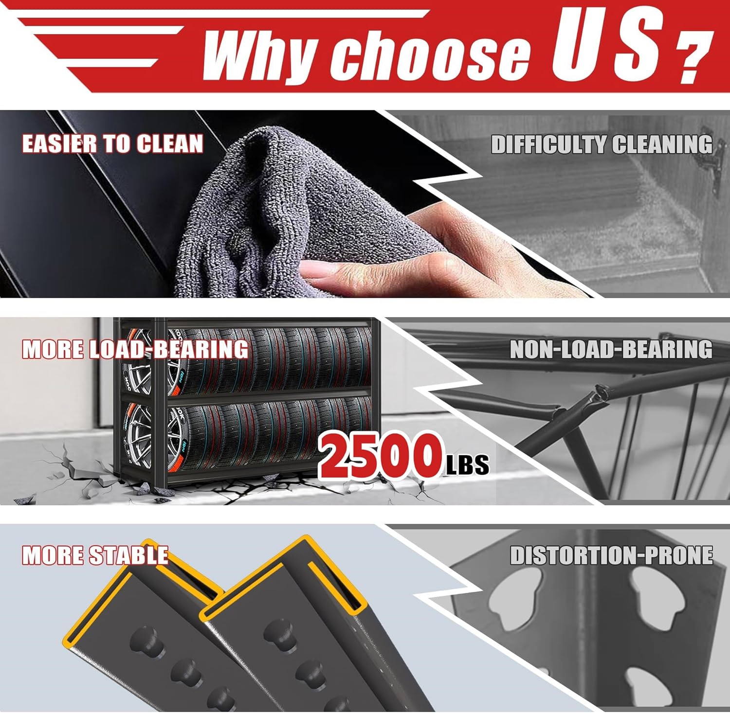 - 【Heavy-Duty 2500 lb Capacity】 Constructed with industrial-grade steel and reinforced crossbars, this 5-tier shelving unit supports up to 500 lbs per shelf (even distribution), ideal for storing heavy tools, automotive parts, or warehouse inventory without bending or wobbling.