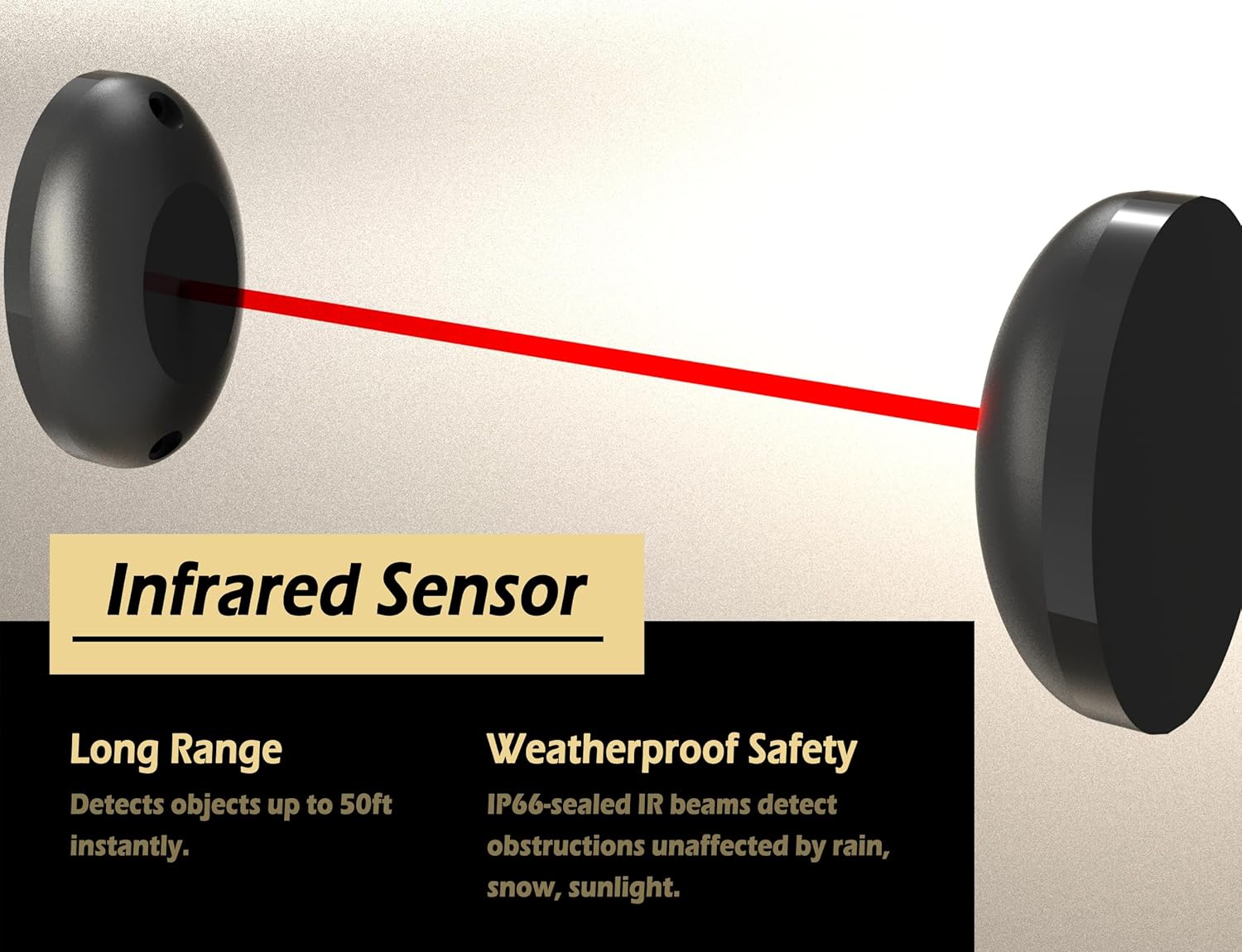 - 🛡️【Safety Features & Auto-Close Function】- Equipped Enhanced safety with infrared sensors that automatically stop the gate from closing if an obstruction is detected, ensuring secure and efficient operation. The opener can be programmed to auto-close (5s/10s/15s) after passing through. It also includes manual release keys for operation during power outages, ensuring you're never locked out.