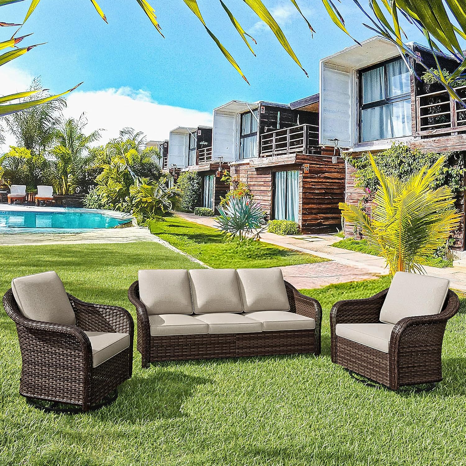 - Packing Included: The 3 pcs set includes 2 x swivel rocker chairs, 1 x 3-seat sofa. The tools and instructions needed for installation will also be in the box.The 4 pieces patio dining set will come in 2 boxes. They may come in different days