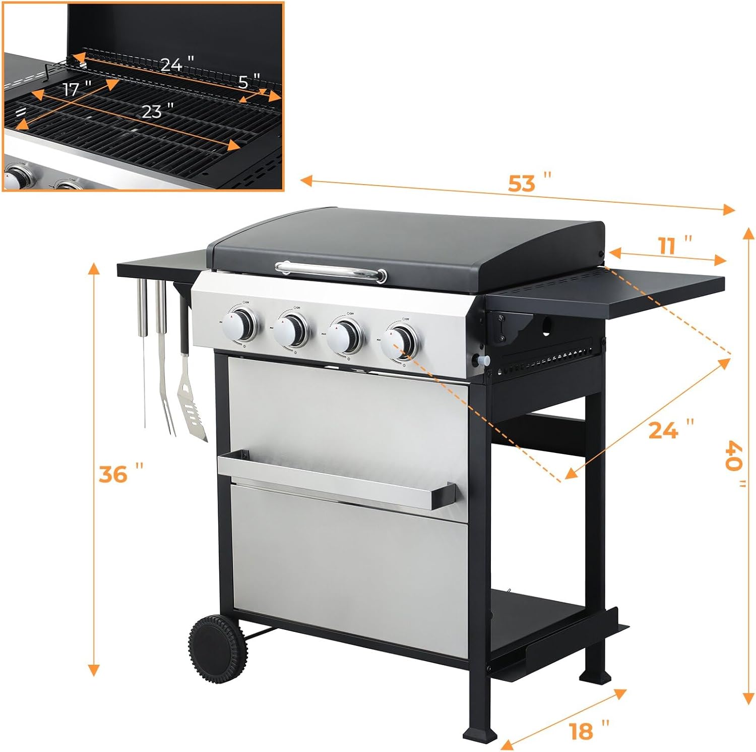 4 Burner Propane Grill with Built-in Thermometer, Durable Lid, Wheels, Foldable Side Tables, Stainless Steel Grilling Pan, 49,200 BTU Gas Grill for Patio, Garden Barbecues