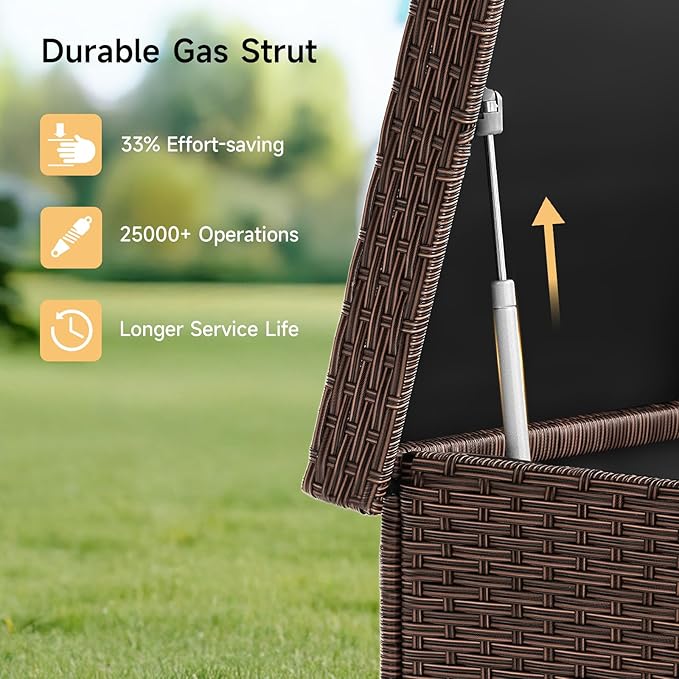 - Enhanced Water Defense: This deck box is designed with each hand-woven rattan component featuring a PP corrugated sheet interior, ensuring items stay dry. The elevated base and reinforced rattan guard against humidity damage, ideal for outdoor cushions and tools storage. Shield your belongings with confidence, knowing they are safe from water-related issues.