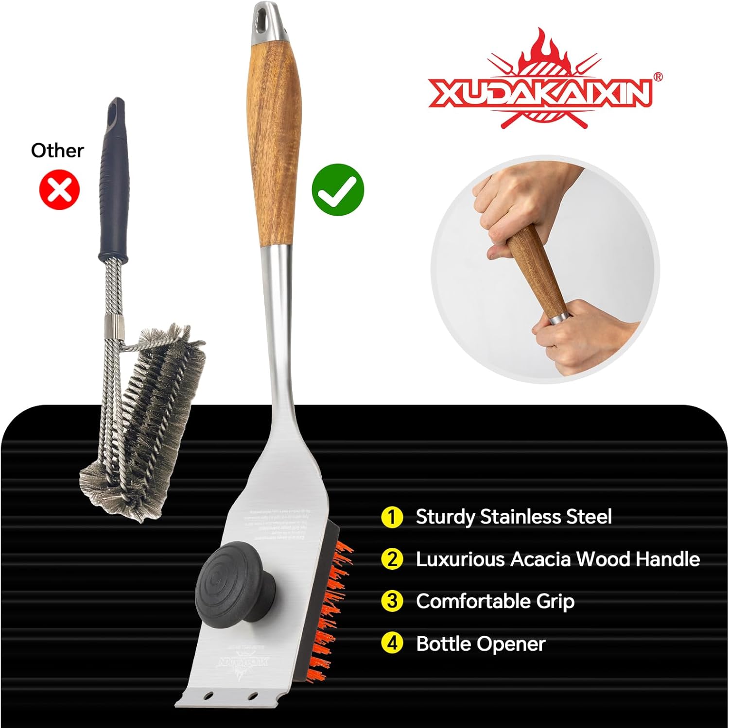 - 【 Comfortable and Sturdy Acacia Wood Handle】Designed for precision and ease, the ergonomic Acacia wood handle offers a secure, comfortable grip, making this brush as practical as it is visually appealing-an essential premium tool for any grilling enthusiast