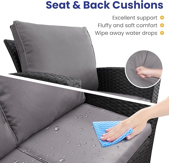 - Oversize Outdoor Patio Furniture Set:FHFO wicker patio furniture set with widened armrests,and curved backrest is ergonomically designed to bring comfort to the back. Wide and deep patio sofa cushioned by soft padded seat cushions will make you forget your fatigue and enjoy your leisure time completely