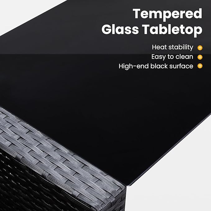 - Ergonomic Comfort:High-density foam cushions with breathable polyester covers provide lumbar support. The PE wicker is waterproof. The large, long glass top table provides plenty of space for snacks and drinks and is easy to clean. If you feel too tired to wipe the table top, you can rinse it directly with water, which is very convenient