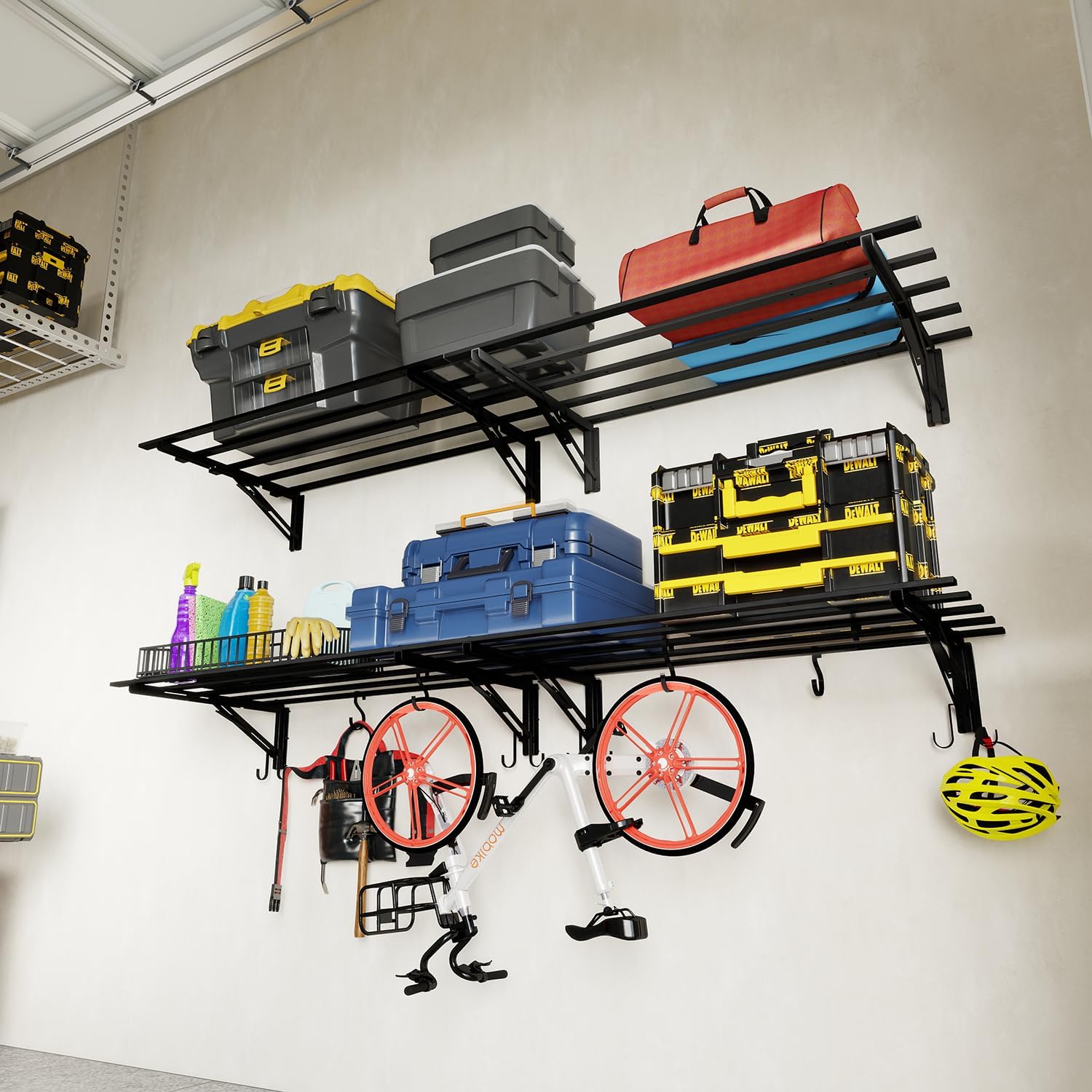 - ๐๐ง๐ญ๐๐ ๐ซ๐๐ญ๐๐ ๐๐จ๐จ๐ค๐ฌ ๐๐จ๐ซ ๐๐๐ฌ๐ฒ ๐๐ซ๐ ๐๐ง๐ข๐ณ๐๐ญ๐ข๐จ๐ง: This garage wall shelf includes sturdy hooks for hoses, cords, and tools. Perfect garage wall shelves for decluttering, it turns chaos into neat, accessible garage shelves wall mounted storage.