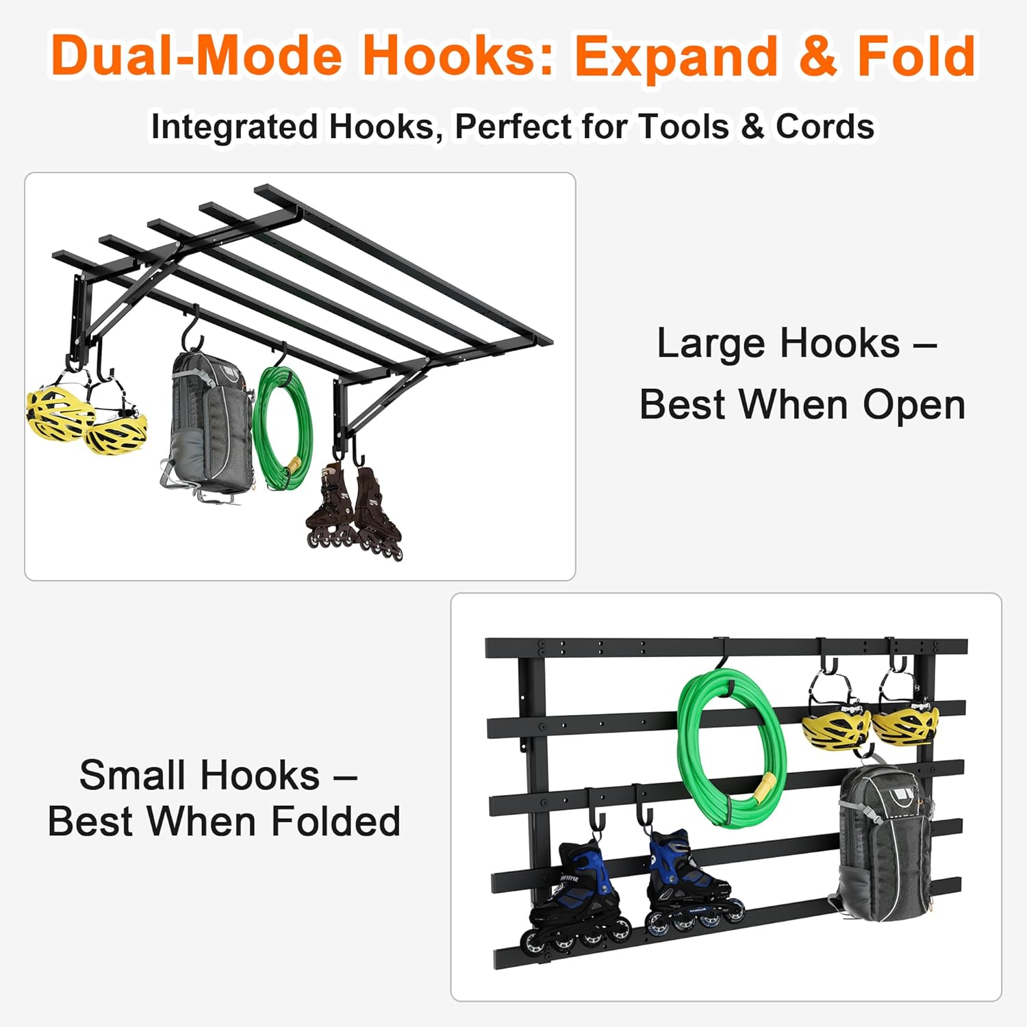 4-Pack Garage Storage System Shelves 3.21x1.64 ft - Compact Folding Wall Shelves for Garage, Sturdy Metal Wall Shelving with Hooks, Versatile Metal Hanging Shelf Design, Sleek Floating Black Shelf