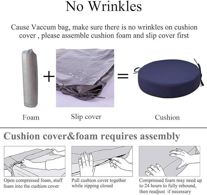- 【Comfort & Support】 Experience ultimate comfort with the high density foam of these patio chair cushions set of 2. They provide excellent support for your hip, promoting good posture and allowing you to relax for extended periods of time. All outdoor dining chair cushions are packed with vacuum bag. You need to assemble cushion to make there is no wrinkles in cushion covers