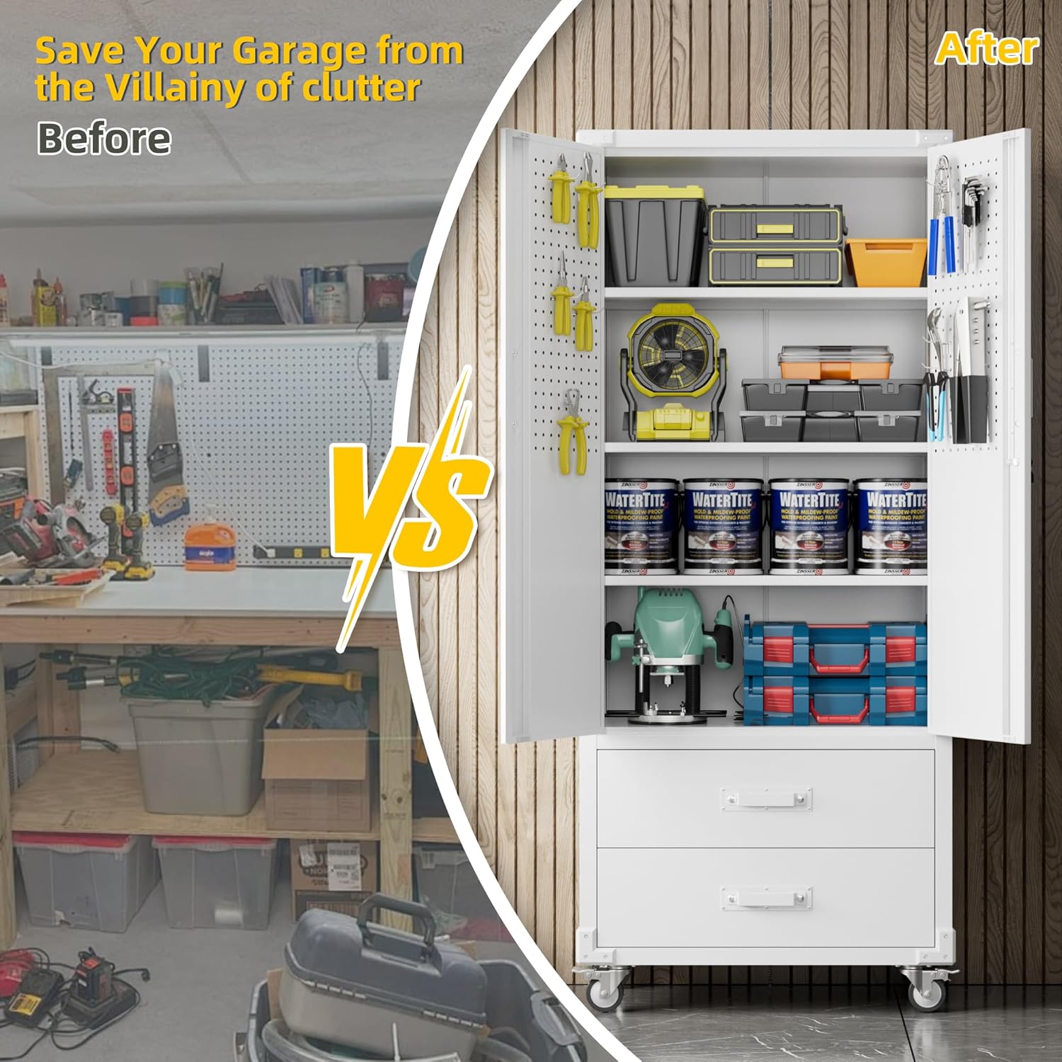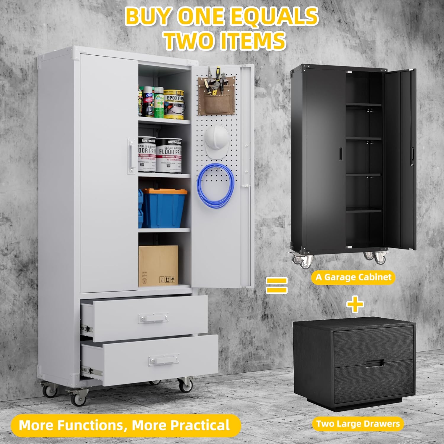 - 【Adjustable Shelves & 2 Large Space Drawer】 Garage storage cabinet has a total of 3 shelves which can be adjusted and also guaranteeing maximum adaptability and convenience for your own unique storage and organizing needs. Each shelf holds up to 120 lbs, which is perfect for storing household items, supplies, tools, documents, etc.This cabinet also have a ball-bearing full-suspension drawer that open and close quietly and easily.