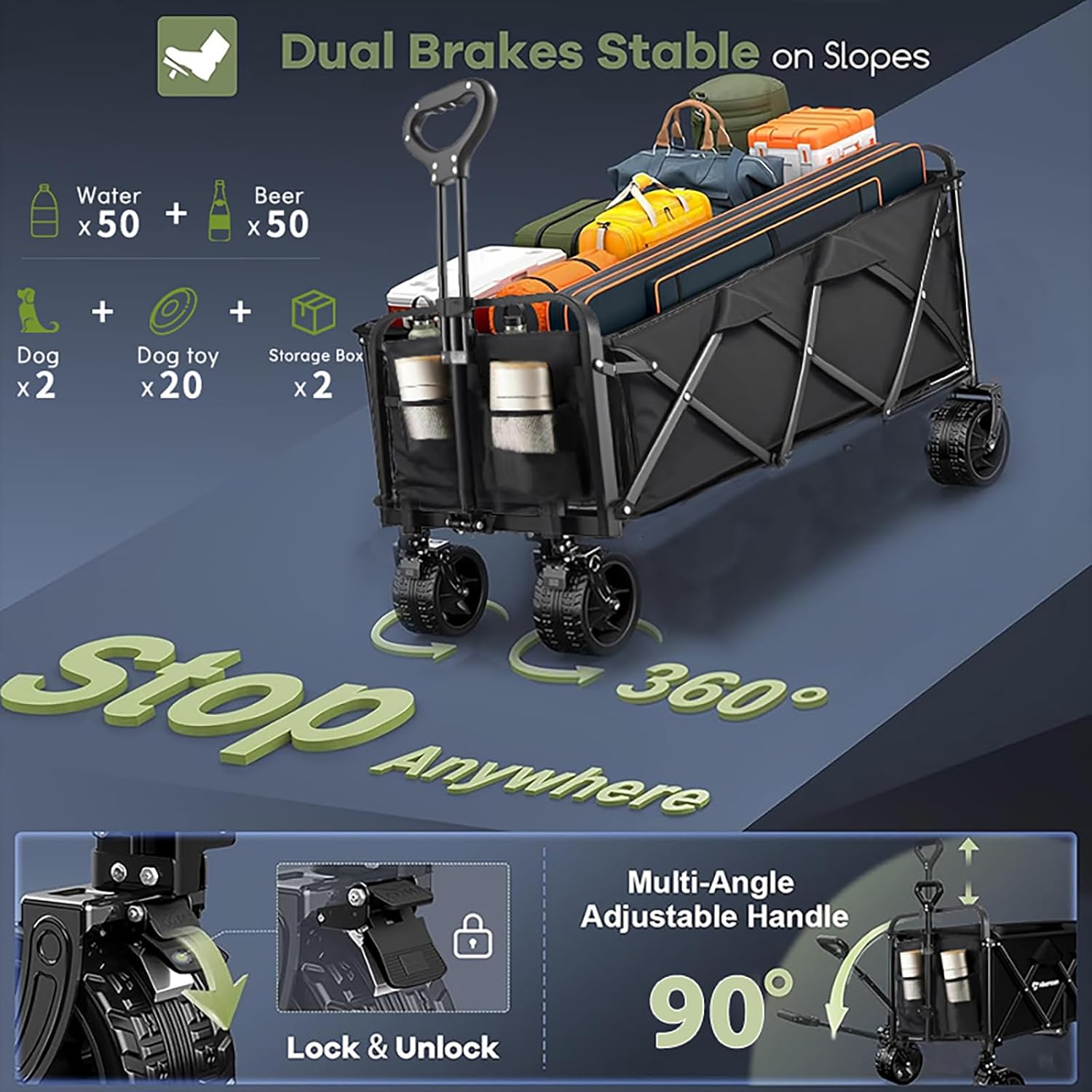 350L Large Capacity Foldable Wagon with Brakes, 560lbs Heavy Duty Collapsible Wagon Cart with Push Handle All-Terrain Big Wheels for Camping, Sports, Shopping, Beach