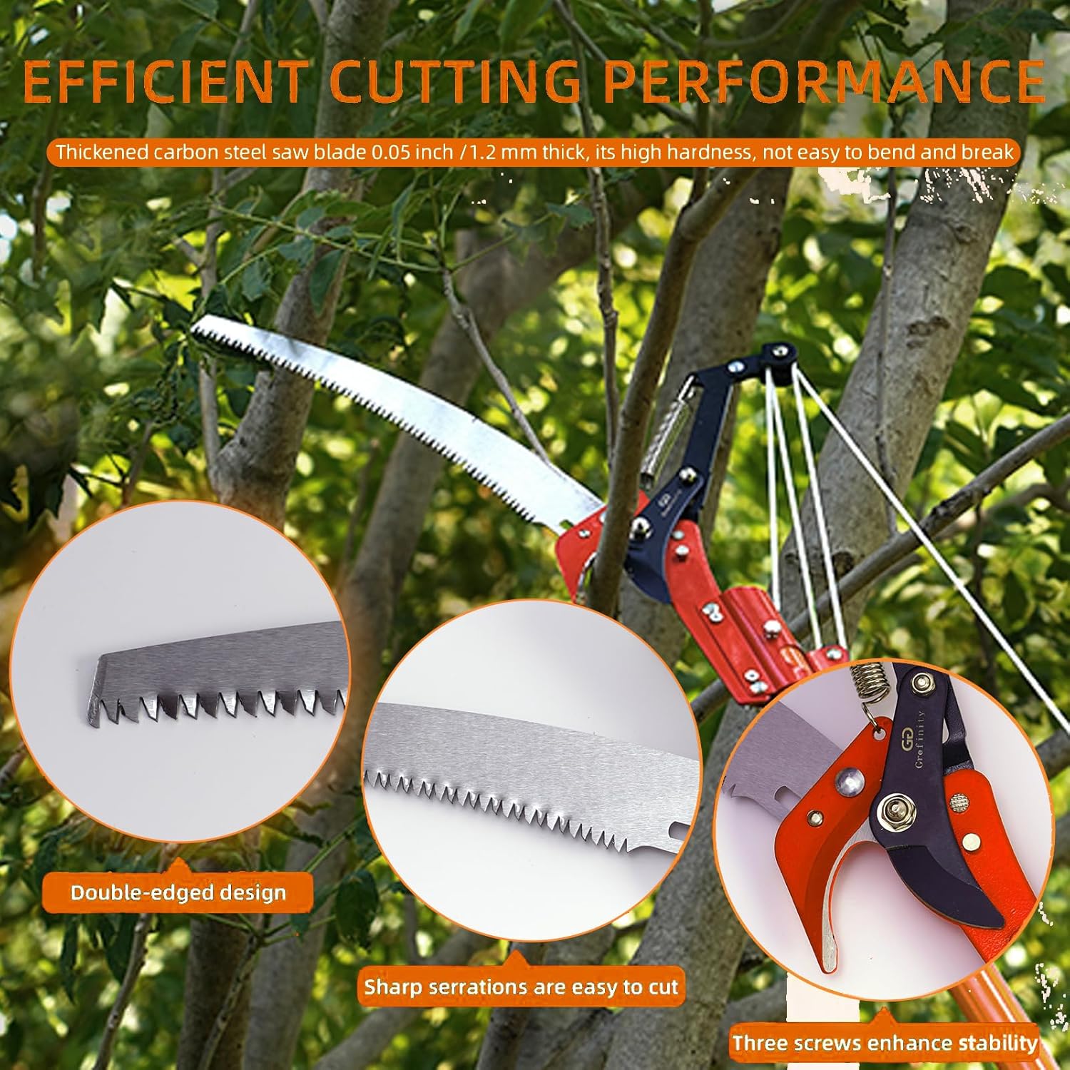 - Efficient Cutting Performance: Equipped with a thickened 0.05"/1.2mm carbon steel blade, our manual pole saw offers superior durability, resisting bending or breaking. The 108° curved saw blade, with dual-hook design at both ends and triple-ground teeth, ensures smooth, stable back-and-forth cutting action on thick branches. Includes two original saw blades for long-lasting use.