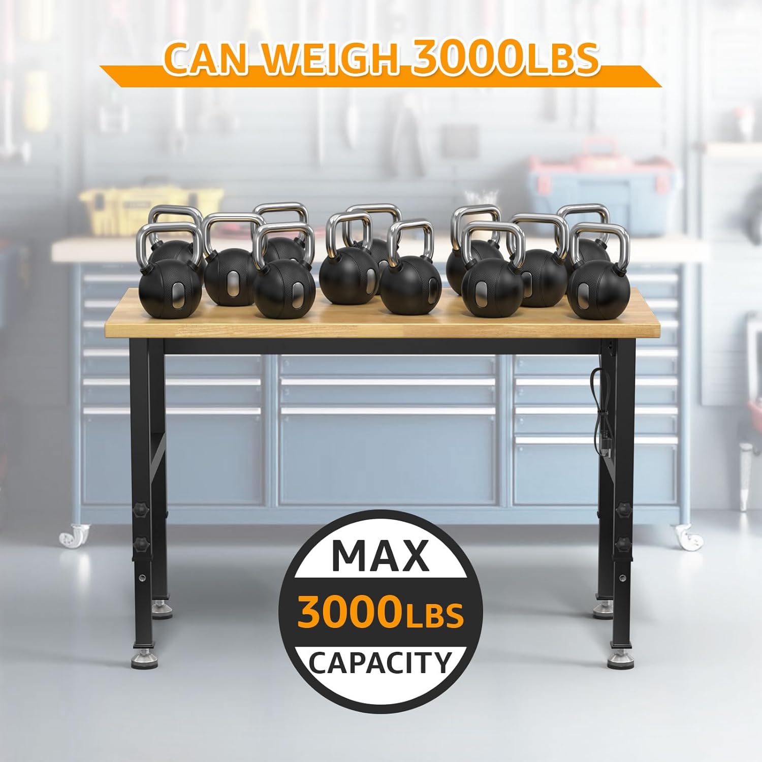 48" Adjustable Workbench,Heavy-Duty Work Table,3000 LBS Load Capacity Hardwood Workstation Outlets with Power Strips and Fixed feet,for Workshop, Garage
