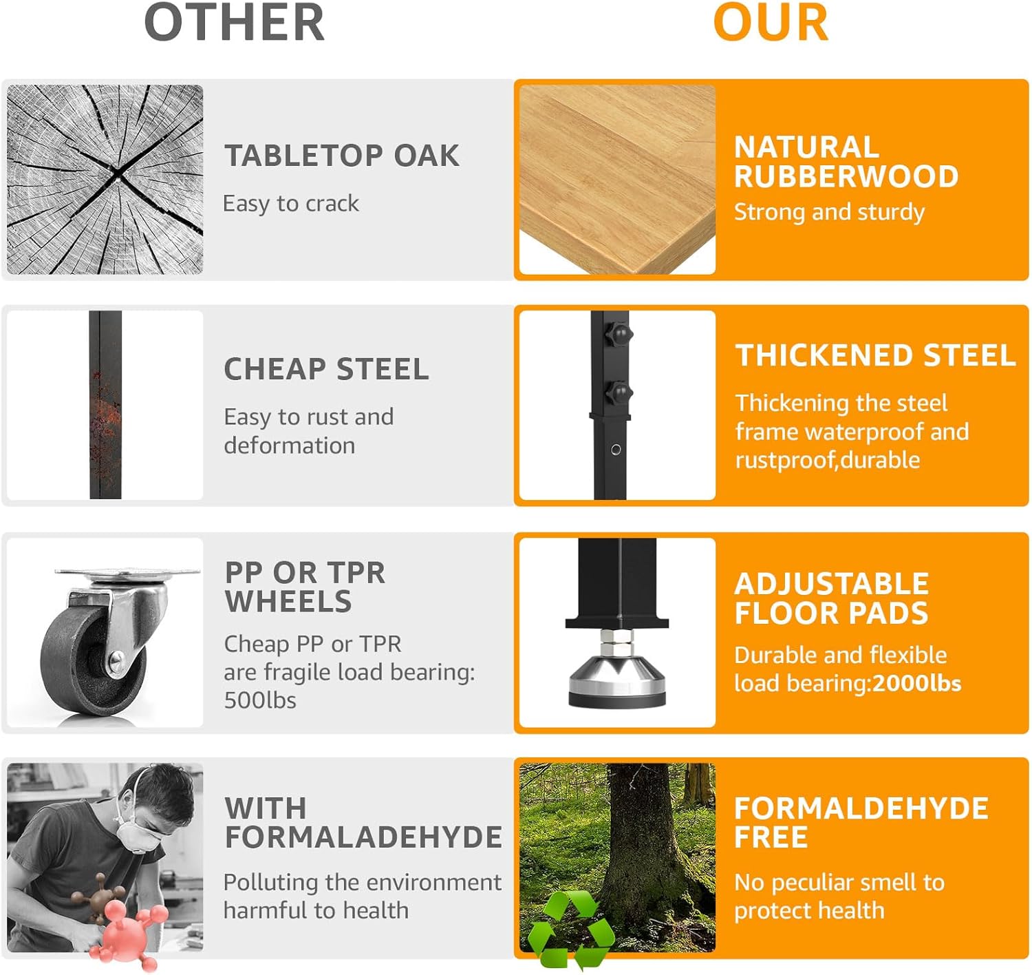 - Stable Construction:The frame of the work table is made of cold-rolled steel plates, which are very sturdy. Several thick crossbars keep the table stable when loaded.Meanwhile, the adjustable workbench is equipped with 4 rubber feet,effectively stopping it from sliding and protecting your floor. Moreover, all accessories, required tools, and detailed installation instructions are included, making it easy to assemble the heavy-duty workbench.