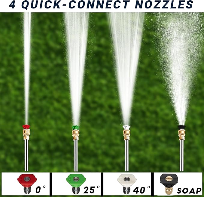 - 【4 Versatile Nozzles – Precision Cleaning Made Easy】Quickly switch between 0°, 25°, 40°, and soap nozzles to match any cleaning task. From blasting away tough grime to gently rinsing your car or patio furniture, this washer is perfect for gutters, sidewalks, decks, RVs, tools, and outdoor living spaces.
