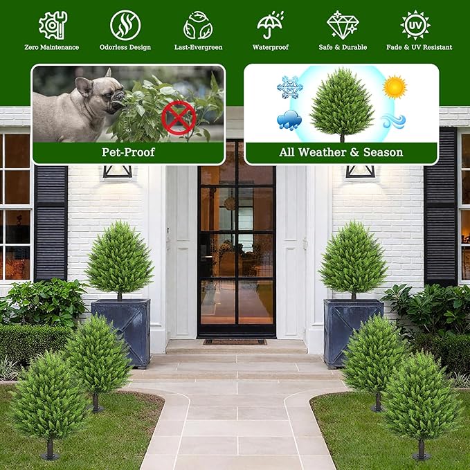 - 【Year-Round Freshness, Effortless & Long-Lasting Fake Cedar Topiary Tree】Tired of watering, pruning, or watching real plants wilt? Set of 2 artificial cedar topiary trees, no maintenance required, bring lush, vibrant greenery to any space(indoors or outdoors). The total height 31 Inch including ground spikes( the ground height measuring 23.6" ). Outdoor simulated pine cypress plants, Odorless Design, Pet-Proof, long-lasting green, Weather&UV Resistant, waterproof