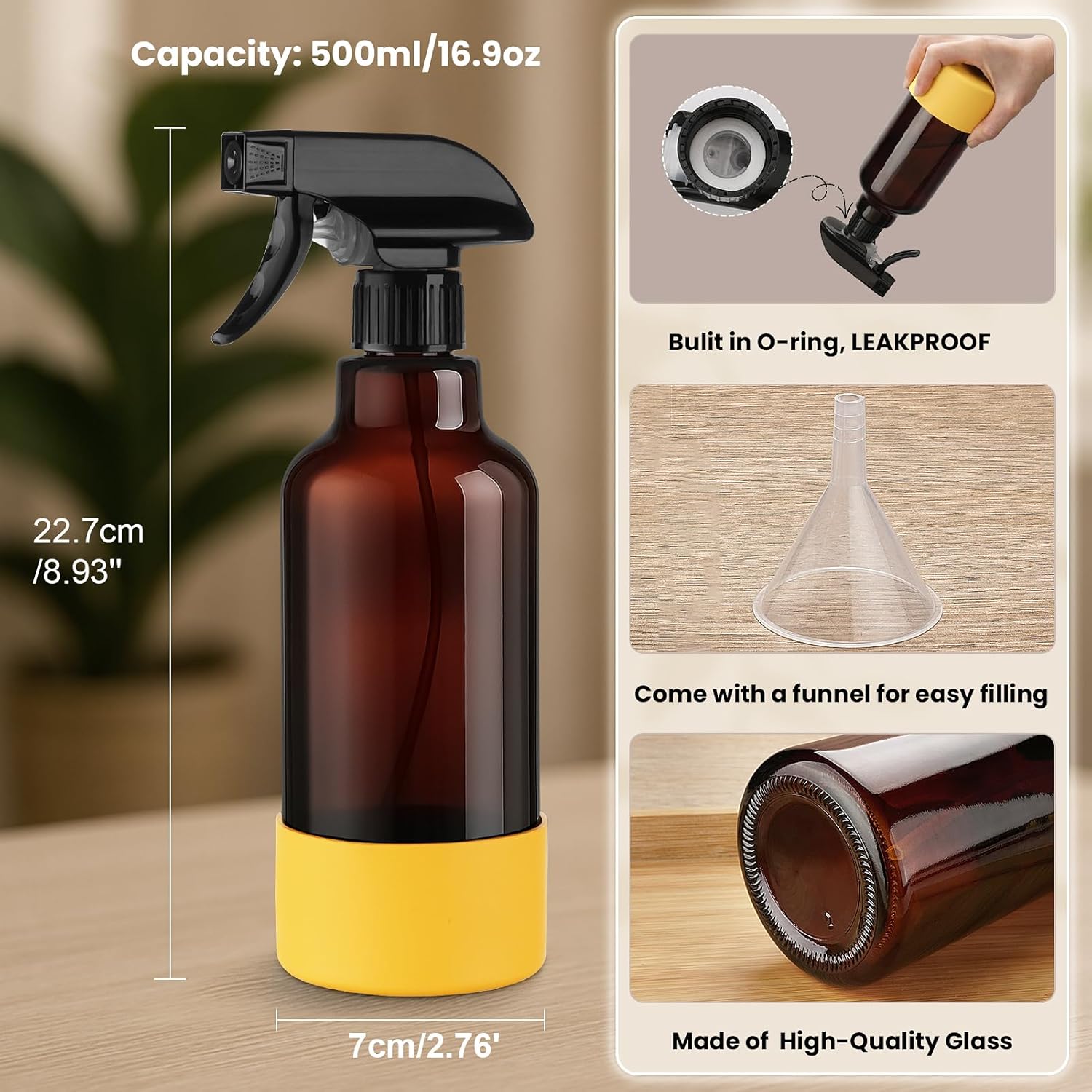 Glass Spray Bottles with Silicone Sleeve 16.9oz 2 Pack Empty Spray Bottle for Hair Mist/Stream Spraying for Cleaning Solutions, Plants, Essential Oils (Brown-green&yellow)
