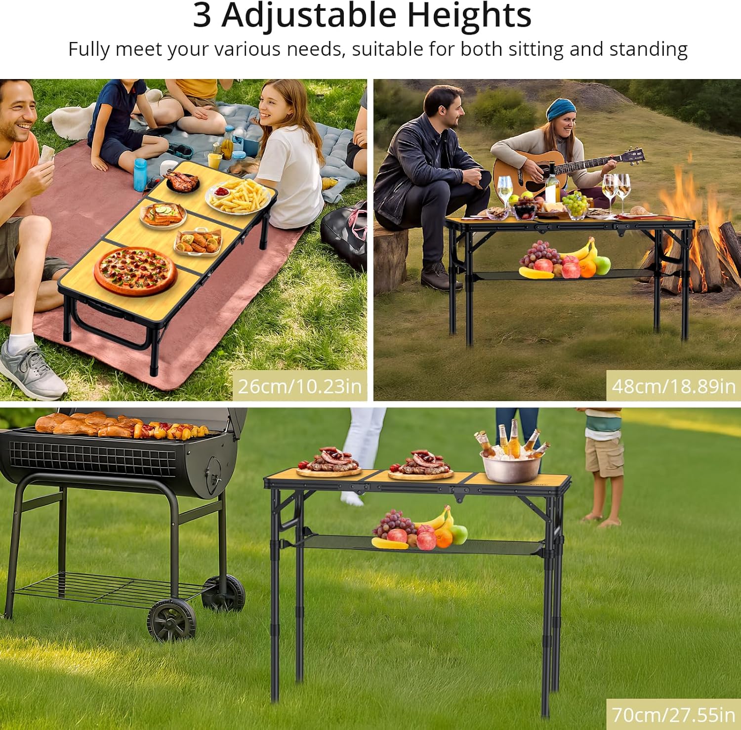 - 3 Heights with Adjustable Legs: You have 3 fixed length for the legs of the table with a height of 10, 19 and 27.5 inches (26, 48 and 70cm). You can sit on the lawn when picnic with the lowest height. Or you can siting beside the table with chair when adjusted to the highest height