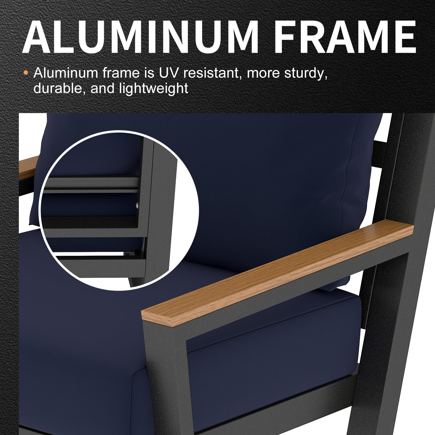 - 【Durable All-Aluminum Frame – 500 lb Weight Capacity】 Crafted from a lightweight yet sturdy powder-coated aluminum frame, this outdoor furniture set resists rust, corrosion, and fading. Engineered for strength, each seat supports up to 500 lbs, ensuring stability and long-lasting durability while adding a sleek, modern touch to your patio.