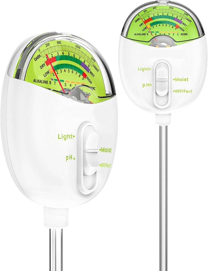 - All-in-One Soil Monitoring Tool: Designed to test soil moisture, pH level, nutrient content (Nutrient SHARED with "OFF" Button!) and sunlight intensity in one device, this soil tester helps optimize plant health by giving you clear insights into soil conditions. Ideal for smarter watering, fertilizing, and planting decisions