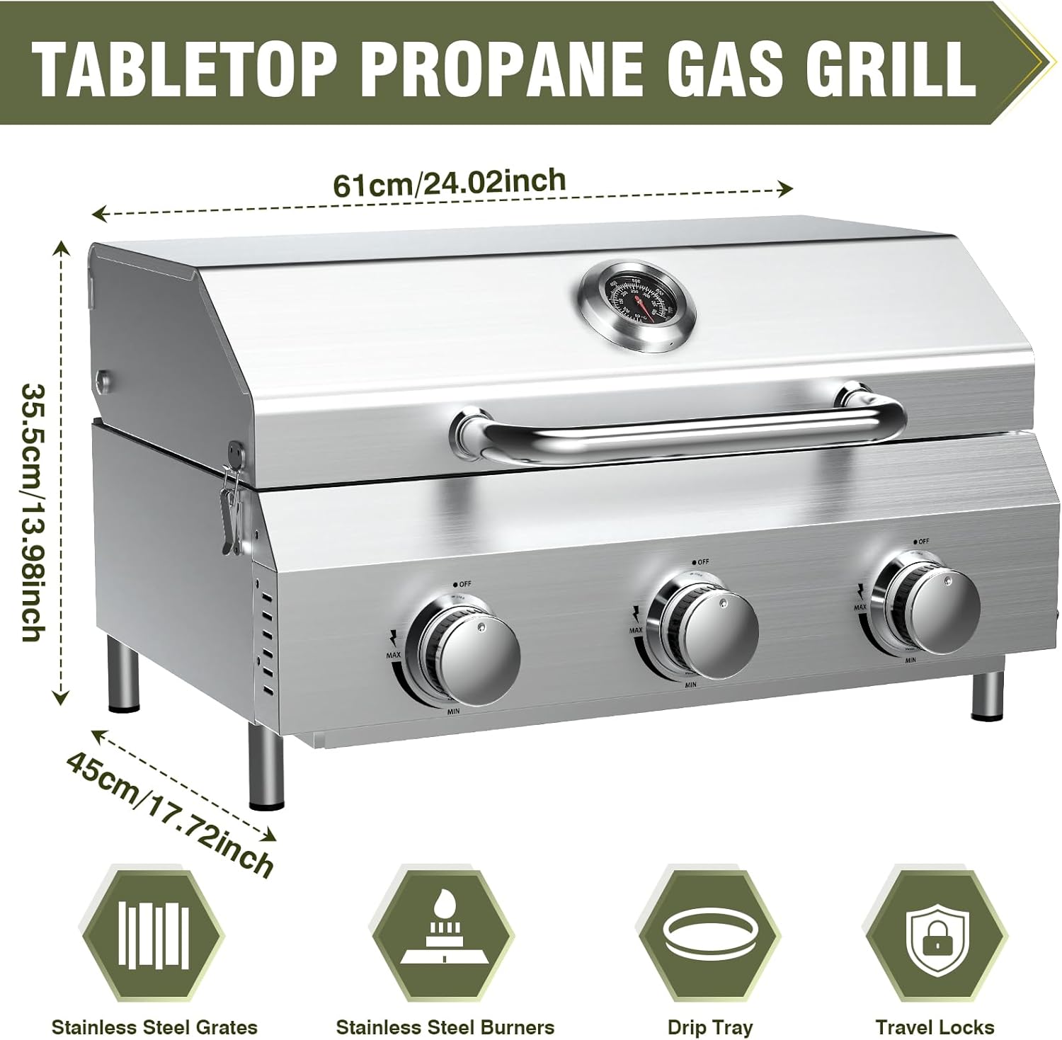 Bestfire 3-Burner Tabletop Gas Grill, 30,000 BTU Portable Propane Grill with Heavy-Duty Thickened Grates & Stainless Steel Knobs, Compact Design&Detachable Legs for Camping, RV, Backyard BBQ