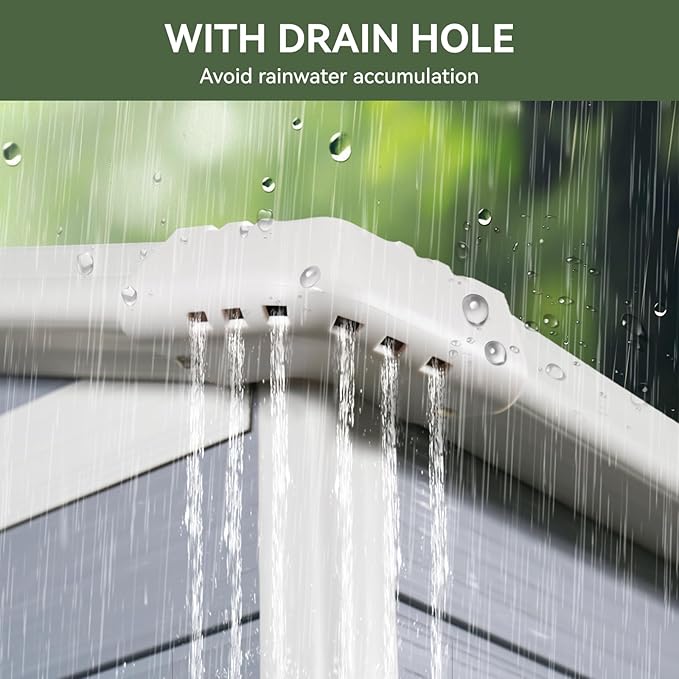 - Secure Storage System :The pitched roof construction effectively channels rainwater and snow to avoid water leakage from the top. Equipped with three-point anti-theft locking device access control, which not only prevents items from being stolen, but also blocks the entry of small wild animals.
