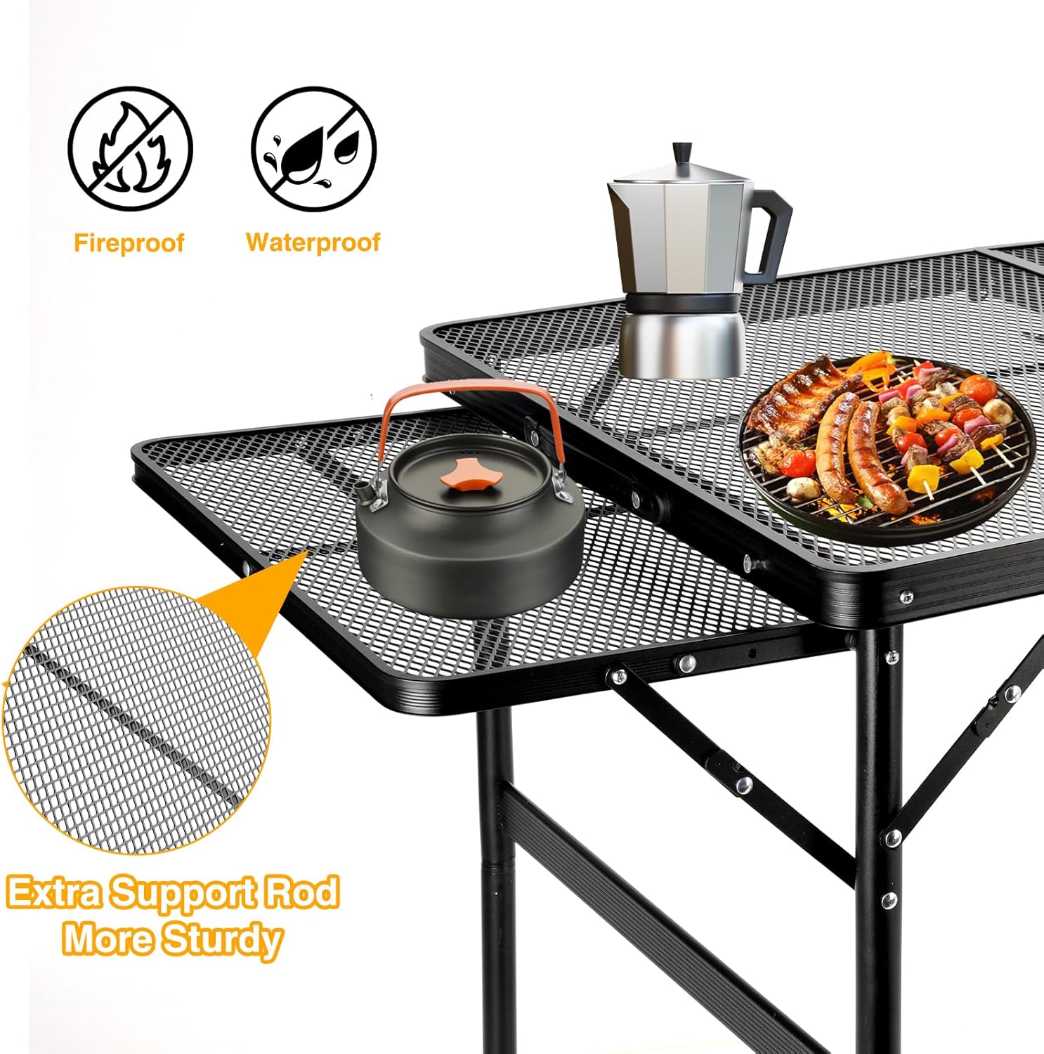- Heat & Waterproof TOP - Moosinily portable grill table, with 1.6mm steel mesh top covered by powder painting, perform well no matter in heat or in water. The eage of the steel mesh has been polished so it would not be sharp for hands. The thicker 1050A aluminum alloy frame with diameter 25mm is lightweight, anti-corrosion and rust resistant which can use for most outdoor scenes in several year. Thickened Support Rods and the tabletop support rod keep the table stable, this folding camping table has a load capacity of 100 lbs and the table extension board has a load capacity of 30 lbs (evenly distributed)