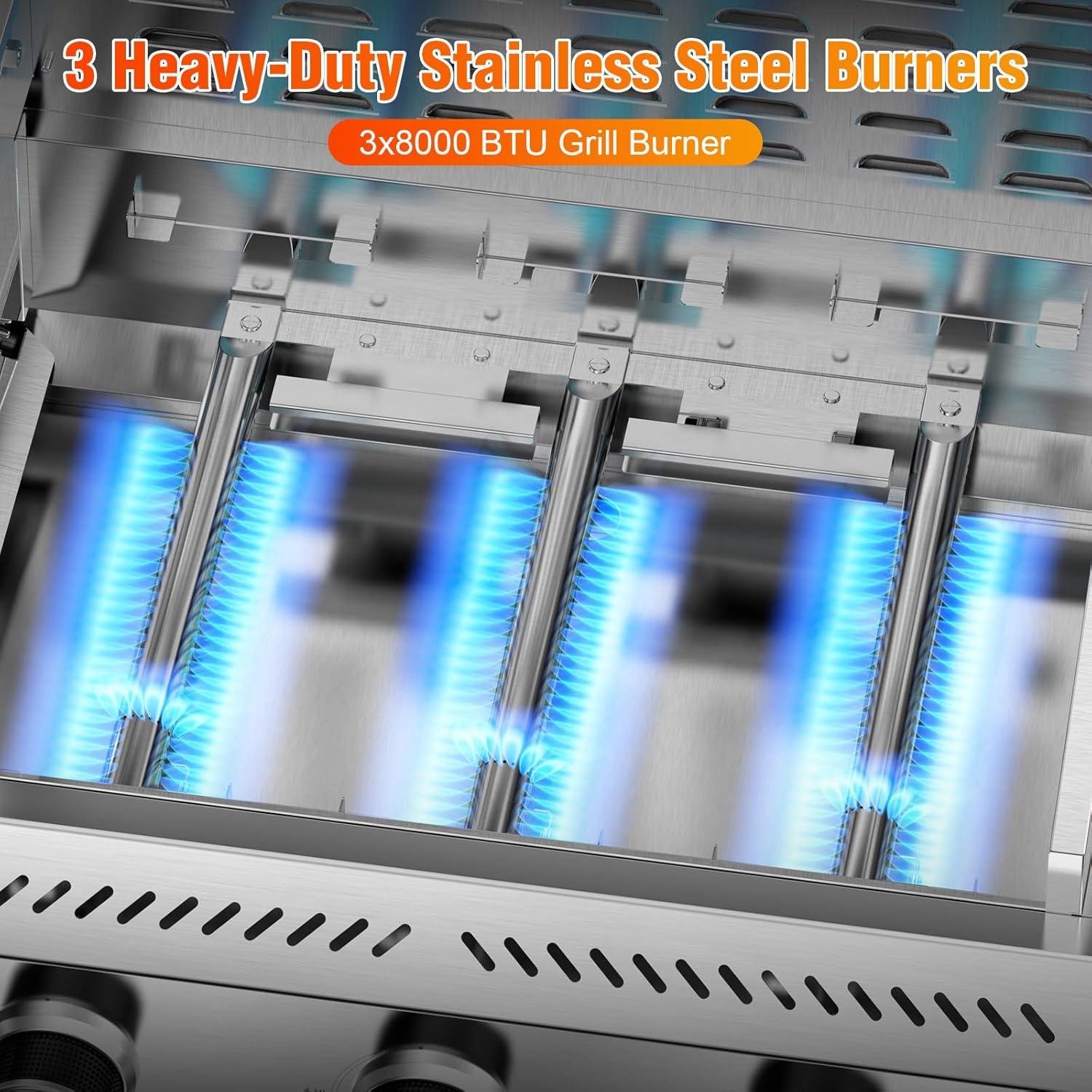 3-Burner Gas Grill with Folding Side Tables,Stainless Steel 24,000 BTU BBQ Grill,Outdoor Propane Grill for Barbecue,Patio,Camping